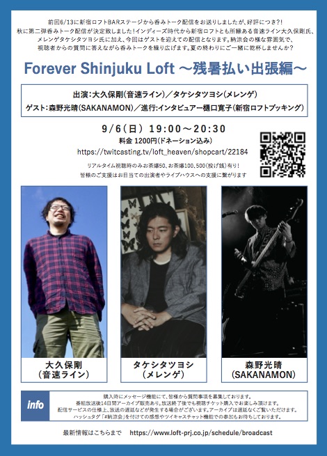 前回、6/13に「Forever Shinjuku Loft #stayhome_loft」と題し、呑みトーク配信をしましたが、好評につき?!9/6(日)に第二弾呑みトーク配信が決まりました!
