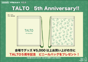 さらにこの日より、ライブ会場でアーティストグッズを¥5,000-以上お買い上げの方に、SAKANAMONが所属するmurffin discs内ロックレーベル『TALTO』5周年を記念して製作されたオリジナルビニールバッグをプレゼント!