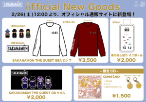 明日2月26日(土)12:00より、SAKANAMON公式通販サイトBASEにて、新グッズ『SAKANAMON THE QUEST GBA ロンT』、『SAKANAMON THE QUEST GB タオル』、『肴のぬし釣り ミニボトル』、さらに会場限定盤CDとして販売していた『quest.ep』の発売が決定!
