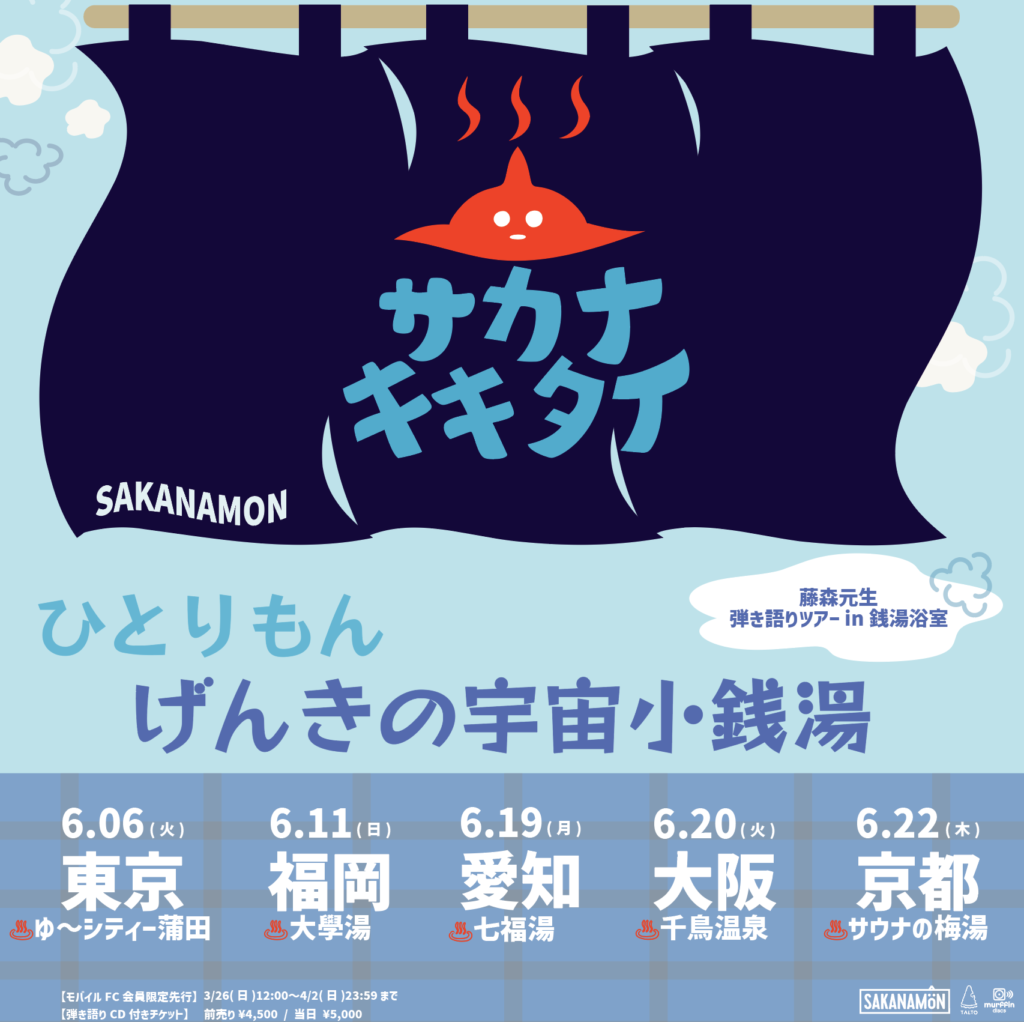 東京・名古屋・大阪・京都・福岡の銭湯を回るツアーでライブは全て銭湯浴室にて行い、チケットには銭湯浴室で録音されたオリジナルCDが付き?✨
